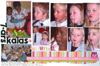 Jag har också scrappat två kalaslayouter. Även detta året blev fotona halvkassa – särskilt de från vårt filmkalas på mitt jobb. Vi bjöd in alla vänner i kyrkan för att titta på film i min skolas filmsal. Det var jättemysigt med popcorn och fika i pausen. Men att ta foton på min skola med brunt tegel och trånga korridorer är omöjligt. Men jag tycker att trots de dåliga oddsen blev layouten helt ok.