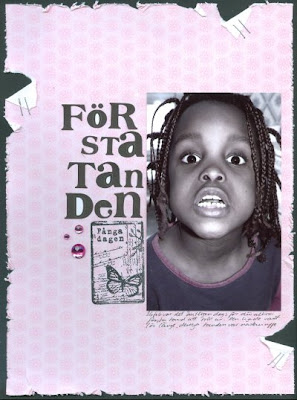 Första tanden måste dokumenteras. Jag har gjort fotot halvt svartvitt vilket ger en soft känsla. Till ett sådant foto passar pastellfärger bra. Jag skrapade kanterna med en Egdescrapper och rev på tre ställen som jag häftade fast. Rubriken är bokstavsstickers från Basic Grey och nedanför den underbara Fånga Dagen stämpeln. Tre blingstenar fick bli pricken över i:et på den här layouten.