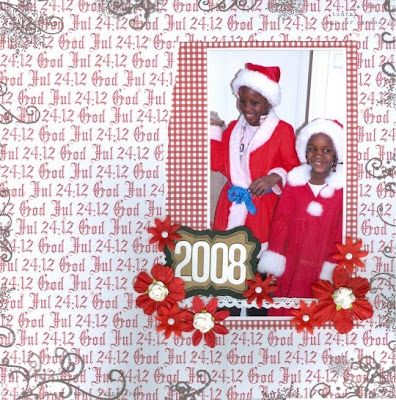 Två foton med tomtar i fokus. Bakgrundspapperet heter Red Macaroni. Det är rött mönster på kraftbakgrund. Jag har också använt en bit av Red Sugar. Rubriken är gjord av vinylthickers och bradsen är av märket Imaginisce.