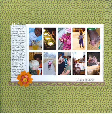 Det här är ett papper från Crates julserie och det heter Snow. Jag har märkt att jag ofta väljer grön bakgrund till mina layouter. Det passar alltid oavsett årstid. Idag blev det en kontrastblomma i orange. Den bruna bården hittar du här.