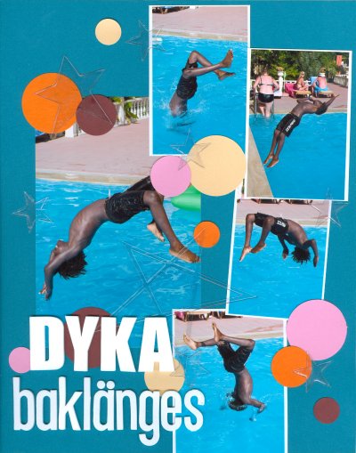Den här utmaningen gick ut på att inte använda mönstrat papper och så skulle man inspireras av ett skivomslag. Det blev en enkel layout med många foton med Benjamin som dyker baklänges. Den ungen kan tusen saker som jag inte ens drömt om att klara!