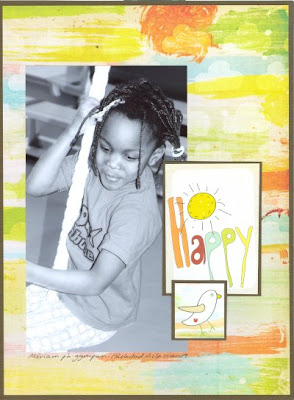 Fancy Pants har till varje serie ett papper med journalingkort och kort med citat på. De är helt underbara och oftast räcker de som dekoration och titel. Happy sammanfattar bra min dotters känsla på sin gympa. Jag ramade in hela layouten med brun cardstock. Jag gjorde samma sak med journalingkortet och den utklippta fågeln för att binda ihop layouten.