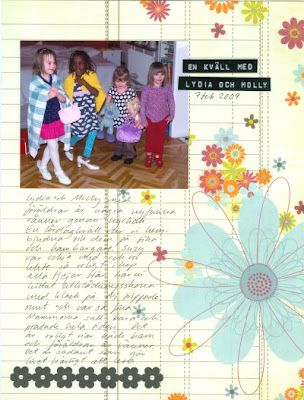 Ett papper som det är kan vara svårt att scrappa men man kan också göra väldigt enkla layouter med det. Här har jag scrappat ett vardagsfoto från en kväll hos goda vänner. Det är foto och journaling vilket räcker. Eftersom papperet är så mönstrat i sig så blir ändå sidan väldekorerad.