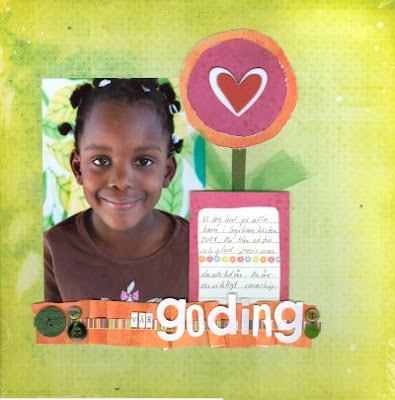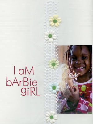 Om man vill kan man scrappa helt utan mönstrat papper. Det räcker med cardstock och lite dekorationer. Här har jag lekt med tyll, punchinella, primablommor och brads. En titel i rött för att fånga upp färgerna från tröjan blev pricken över i:et.