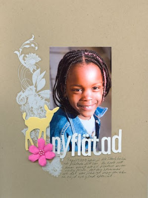 En layout jag är mycket nöjd med. Jag gillar det enkla och rena med bara cardstock och några dekorationer. Det vita är en rubon som jag gnuggat på en OH plast. Det gör att jag kan flytta runt den och placera den som jag vill. Det här är enda sättet för mig att använda rubons för jag kan inte gnugga fast den på rätt ställe på en gång. Jag har ibland gnuggat de på ett papper och sen klippt ut men med en sån här snirklig så går det ju inte. Jag är så glad att jag äntligen använt de underbara rubonsen från Basic Grey. Har du också rubons som ligger en låda och inte blir använda så pröva det här tipset.