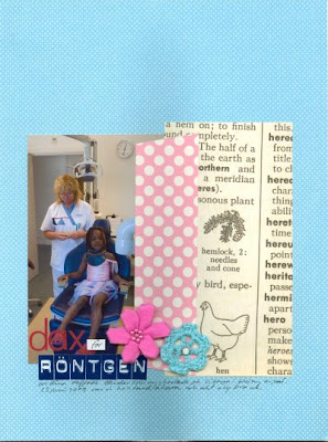 En snabblayout jag gjorde för ett tag sen. Lite småbitar och plock från scrapbordet blev en sida om tandläkarbesöket och röntgen av de utslagna tänderna i början på sommaren. Visst är det härligt med ungar som knatar iväg till tandläkaren i prinsessklänning!