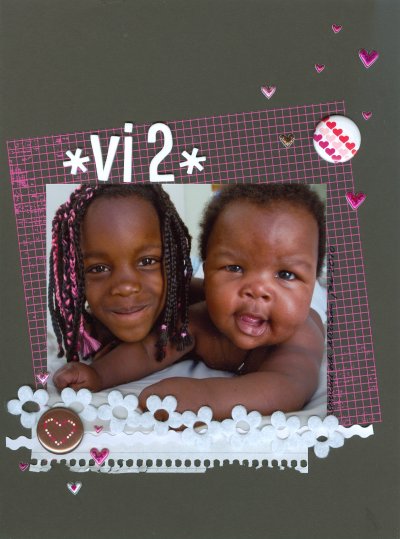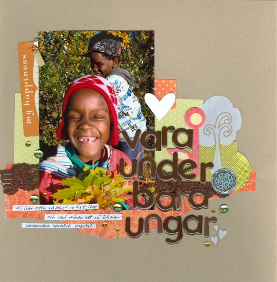 Den här är det längesen jag gjorde. Det känns som att det var i en annan tid – innan Samuel, när jag fortfarande stressade och jobbade massor. Men samtidigt är mina barn lika underbara då som nu. Jag gjorde den här på vår Scrappizredaktionsträff vi hade i november. Det är med all säkerhet en lift från Scrapbook Trends men vilken har jag ingen aning om. Jag kommer ihåg att jag snodde en del bokstäver från Sara för att kunna göra klart titeln.