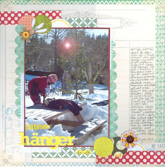 Fotot har ni sett för ett tag sen och så här blev det scrappat. Jag har gjort den till en utmaning på Magdas där vi skulle använda minst 8 mönstrade papper. Bakgrundspapperet är sånt där som jag gillar – färdigt med mönster lite här och där och masa linjer som man kan skriva på. Jag har liksom fortsatt i samma anda och placerat lite remsor och cirklar här och där.