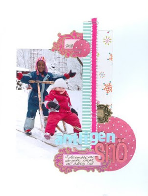 Banden är tillverkade av American Crafts och finns här. De läckra journalingramarna är tillverkade av Hambly. Det randiga papperet har American Crafts gjort och My Minds Eye det rosa med prickar och snöstjärnor. Den prickiga cardstocken kommer från Bazzill.