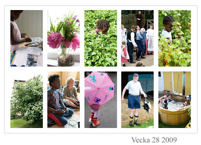 En sommarvecka med mycket regn och inneliv. Trots det så lyckades vi faktiskt pricka in ett besök på självplock av jordgubbar mellan några ösregn. Kvällen vi var på teater var helt fantastisk – både för teaterns skull och vädermässigt. Hemma har vi vinbär som mognat och barnen står där ofta. Det ser så härligt ut när man bara ser några huvuden sticka upp bland buskarna. De cyklar runt och så stannar de till för en bärpaus. Vår stora jasminbuske blommar nu och det är så härligt. När regnet faller så blir det både scrapping, film och tv-spel. Kompisar har kommit på besök och till helgen kom farmor och farfar. På lördagen åkte vi till Fam Bark för att slakta två ankor. Farfar och Peter är värsta experterna. Har ni bra recept på anka så skicka det till oss för vi fick med oss ankorna hem. Veckan avslutades med ett bad i kvällsolen. Imorgon är det Miriams 6-årsdag och vi har städat och förberett i flera dagar.