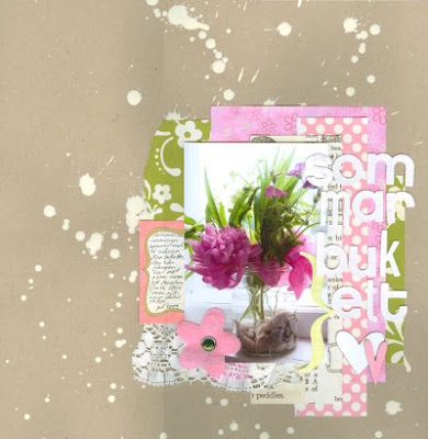 När vi var hos Anna S i juni fick jag prova Helenes sprayfärger. Det var mycket roligt så jag utmanade redaktionen på Scrappiz att skapa med sprayfärg. Kolla här för mer inspiration. På den översta layouten har jag lekt med akrylfärg som jag spätt ut och stänkt på med pensel.